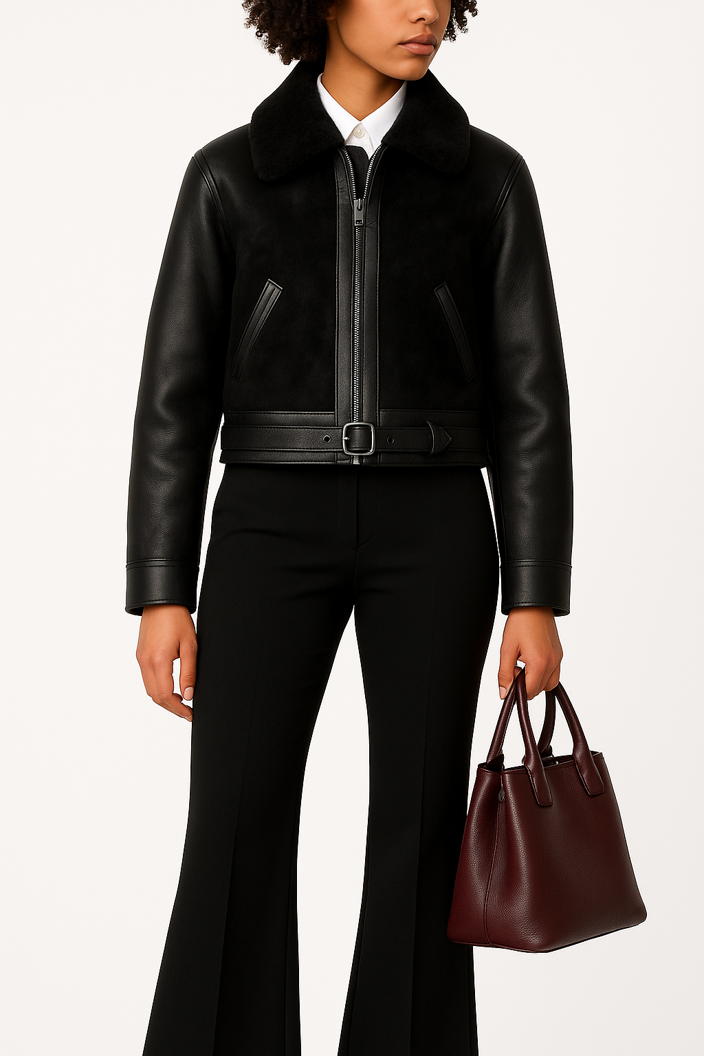 A sharply tailored women’s leather-and-shearling jacket, crafted to command presence. The outer shell is rich black leather (likely full-grain or top-tier calfskin) with smooth, satiny depth; the body panel and collar are lined in plush shearling for visual contrast, luxe texture and refined warmth. The silhouette is cropped to the waist, with structured shoulders, a full-zip front, angled leather-trimmed pockets, buckle-detail belt at the hem, and a wide turn-down shearling collar. It signals modern sophistication — edgy yet elegant — perfectly bridging fashion-forward rock-chic and premium outerwear heritage.